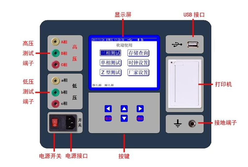三相變比測(cè)試:用于常規(guī)三相變壓器變比與組別測(cè)量。