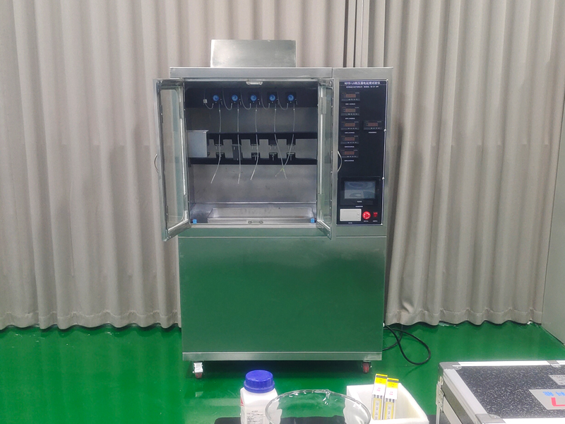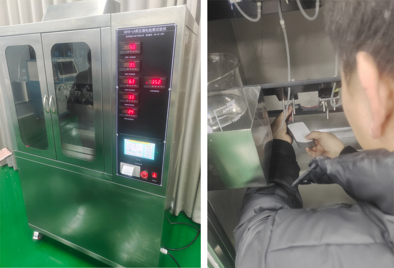 接下來,技術人員對設備的整體結構和工作原理進行了介紹。結合實物,指出了高壓發生單元、精密滴液系統、五組獨立測試單元以及智能控制核心等主要部分的位置與功能。解釋了設備如何在標準規定的電壓下,通過控制污染液滴落的間隔與流速,來監測材料的泄漏電流變化,并最終依據電流值與持續時間對材料的耐電痕化等級做出判定。